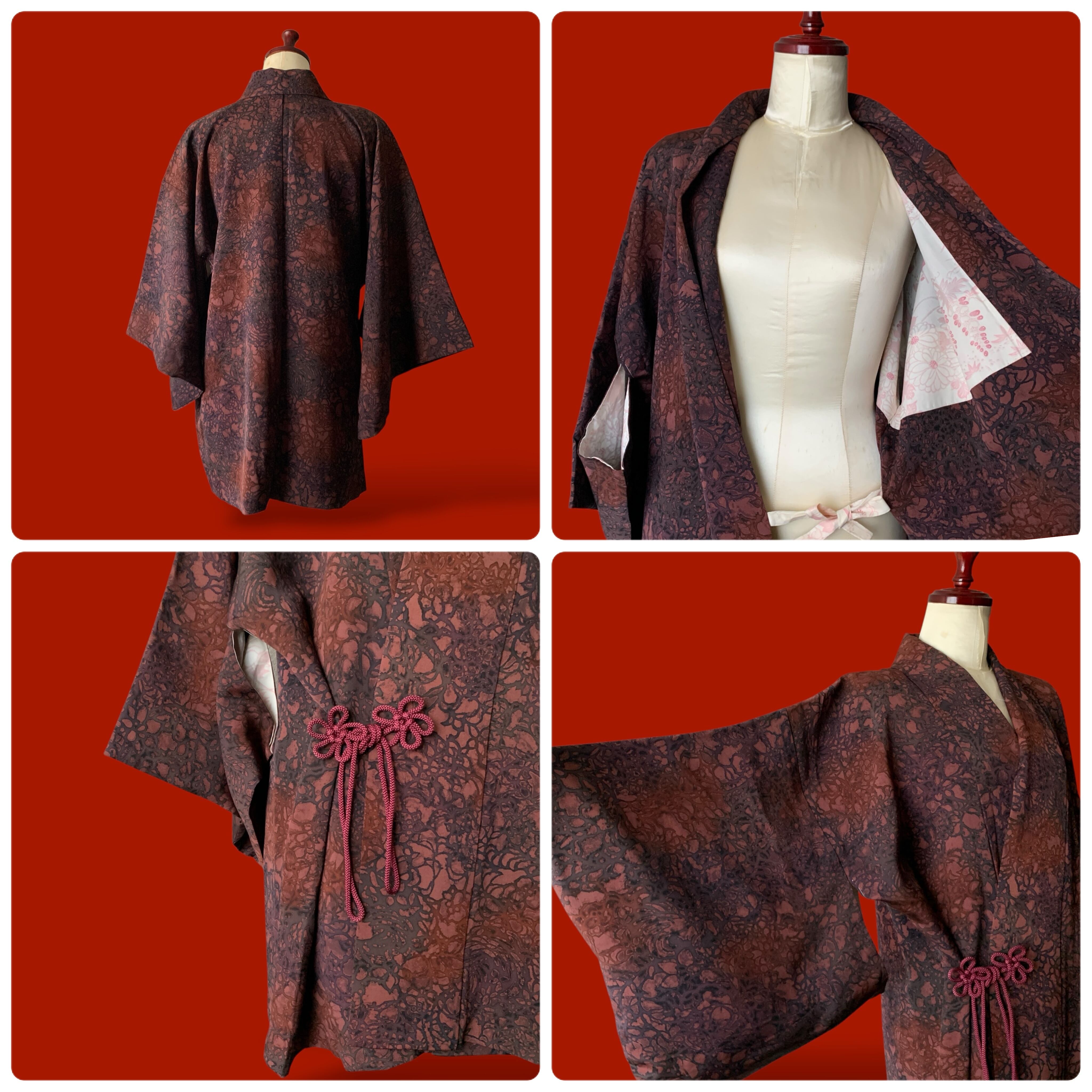 抽象アート羽織りにレトロブラウスを合わせた和洋折衷コーデ4点セット。