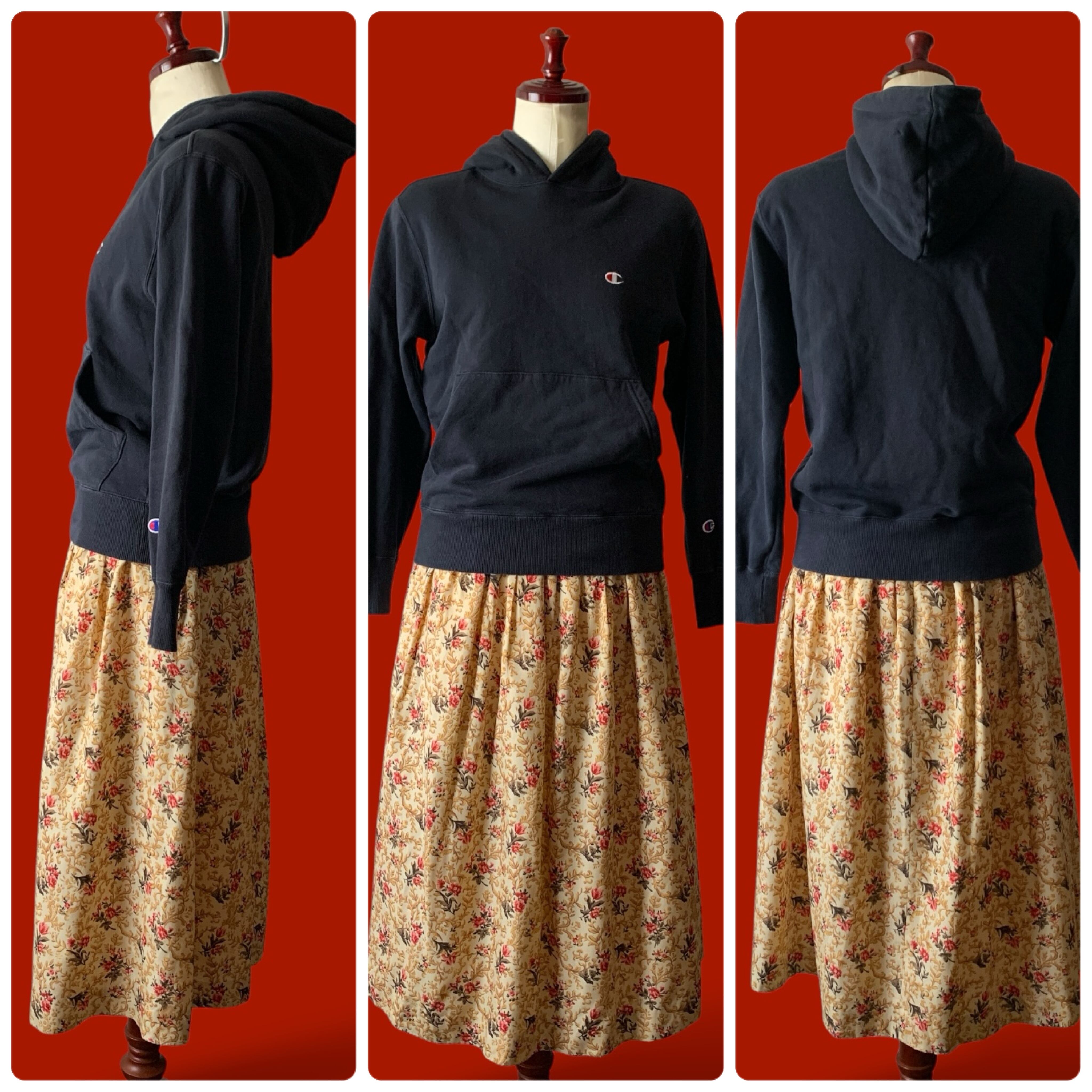 チューリップ柄の軽い紬羽織りにパーカーをイン。花柄スカートで甘さもプラスしたバランスの良いコーデ。