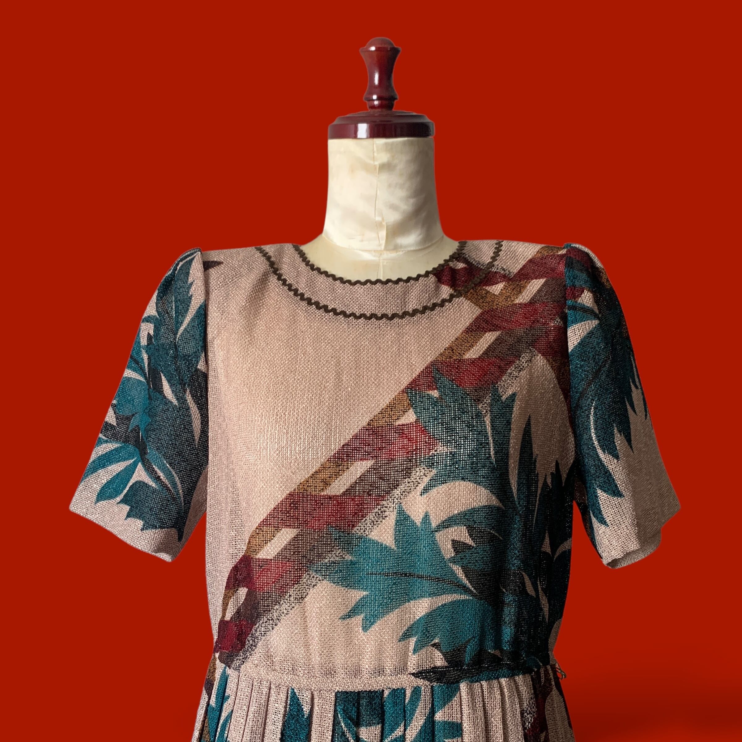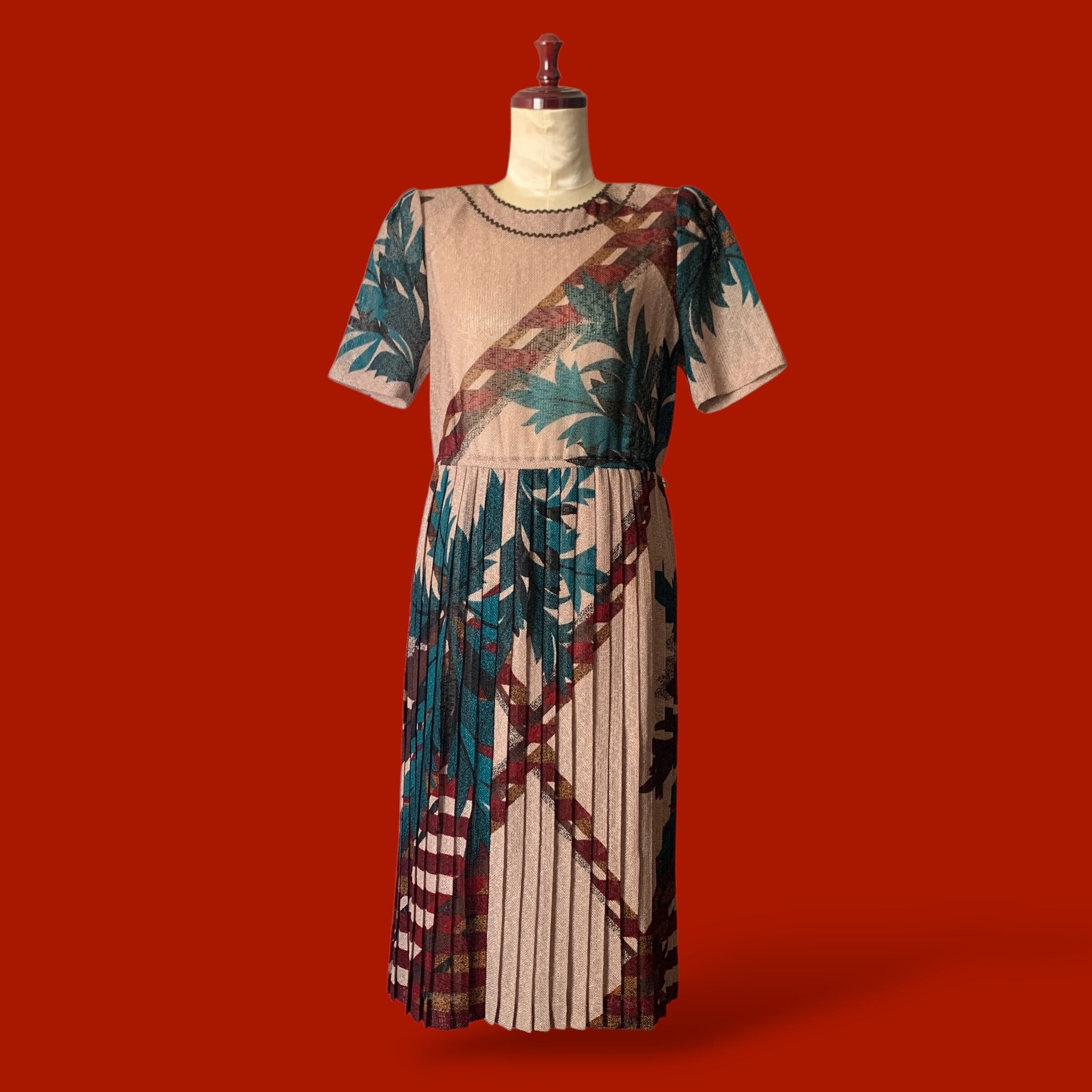 麻のような素材にボタニカルな柄がマッチしたレトロワンピース。