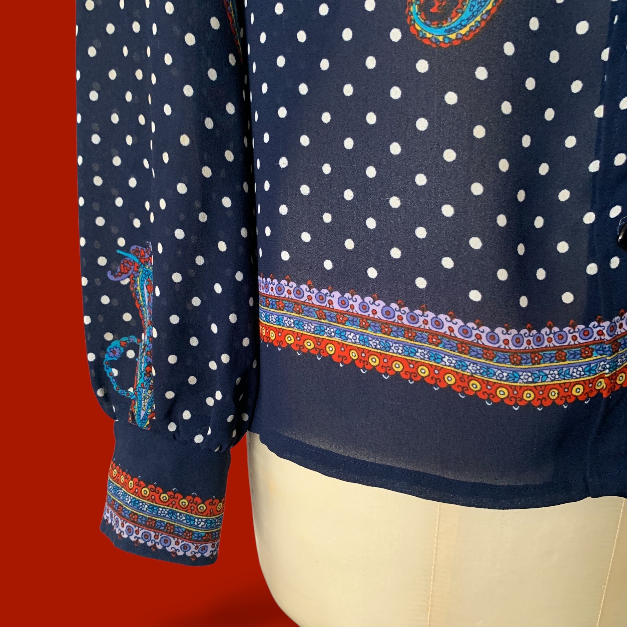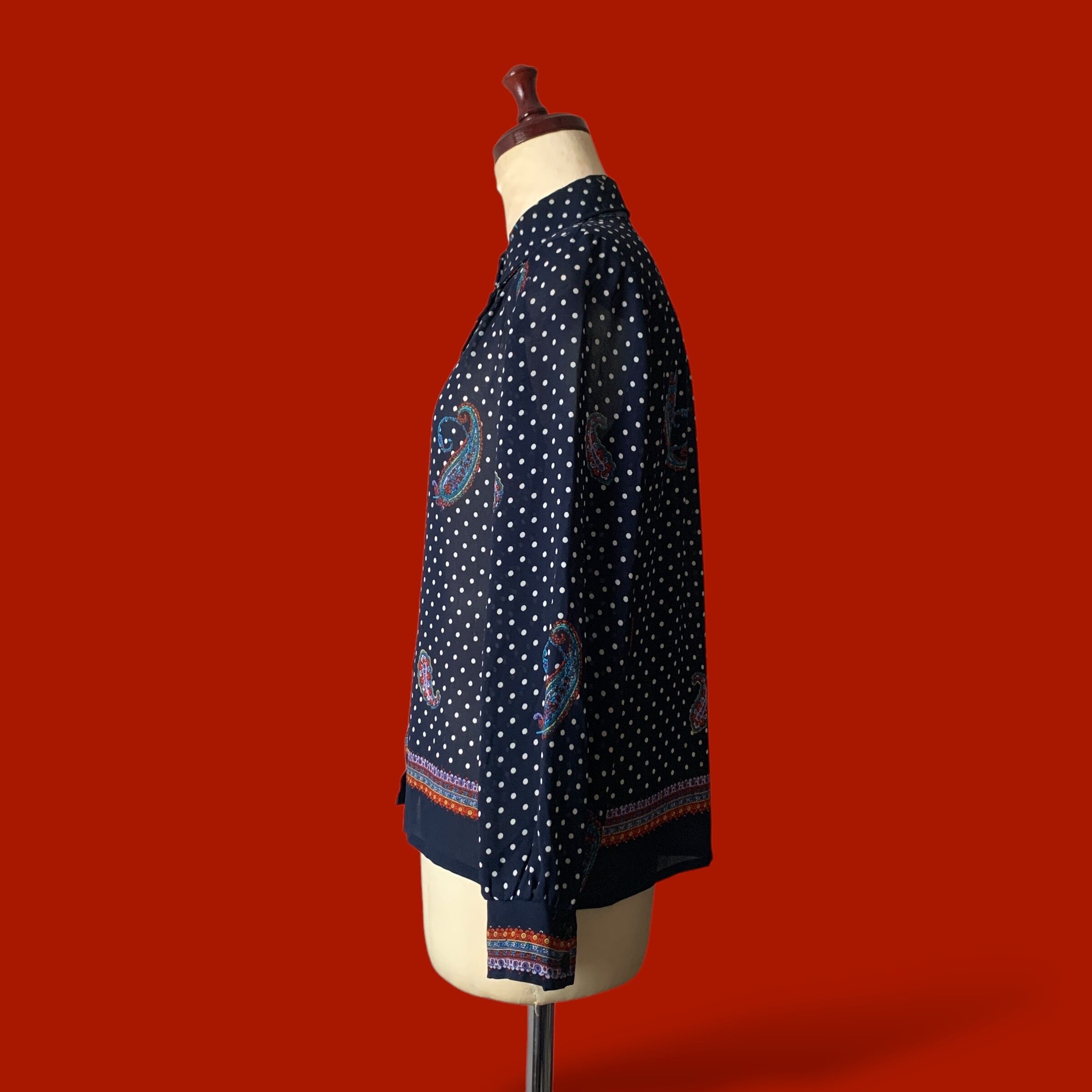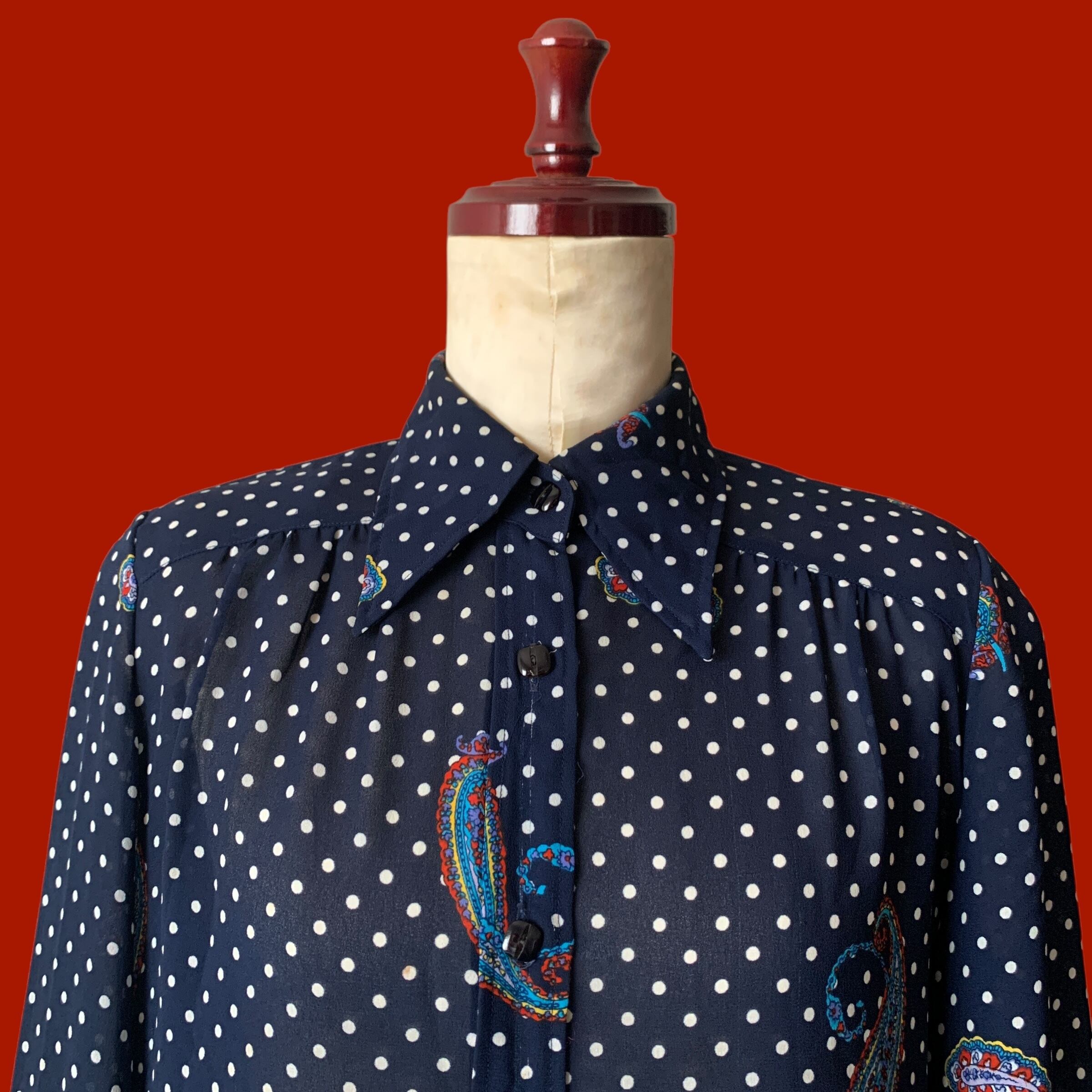 ネイビー地に水玉×ウミウシペイズリーが散る長袖ブラウス。