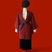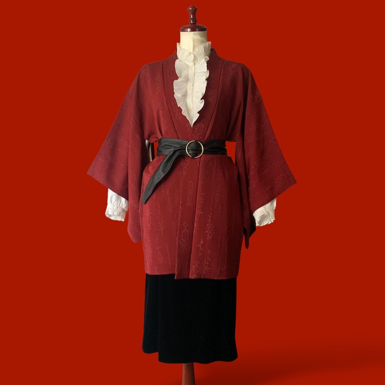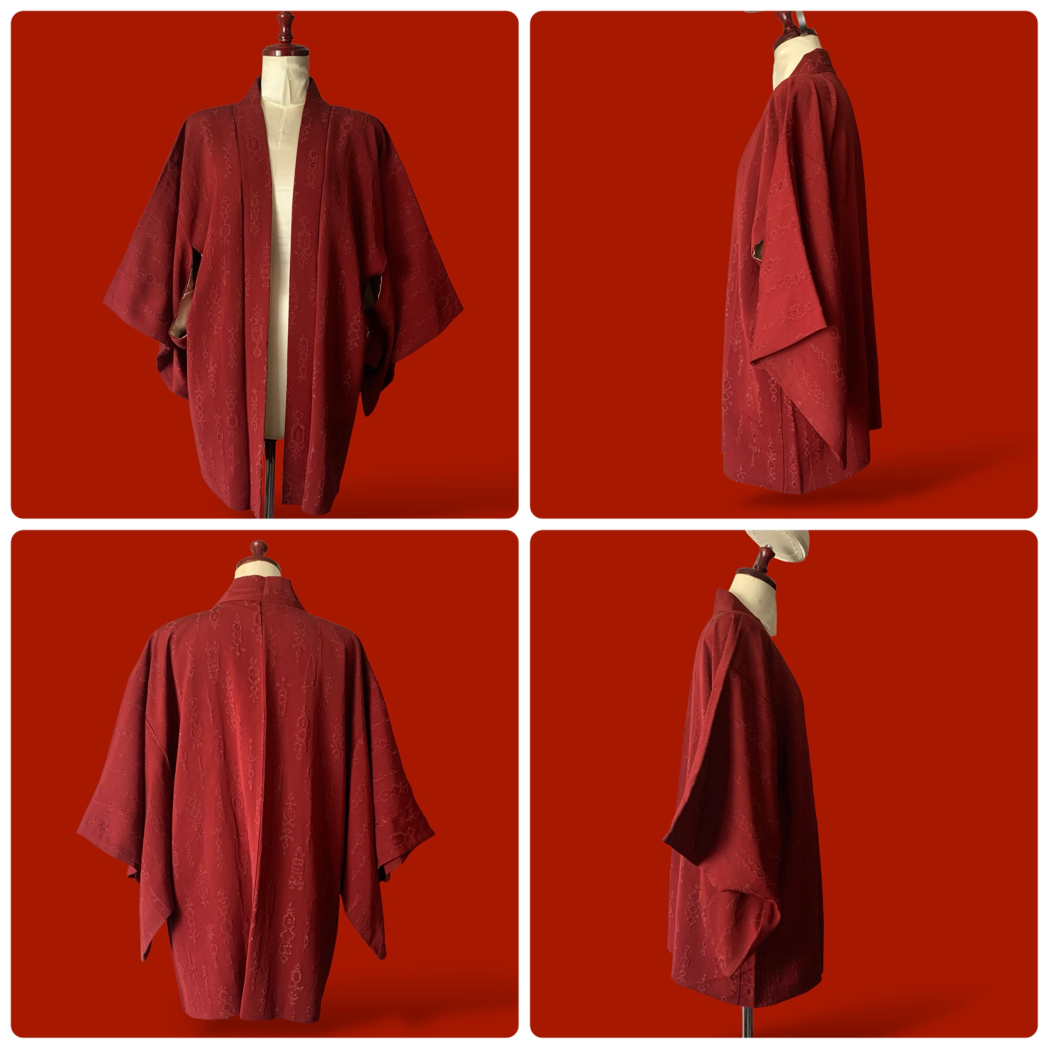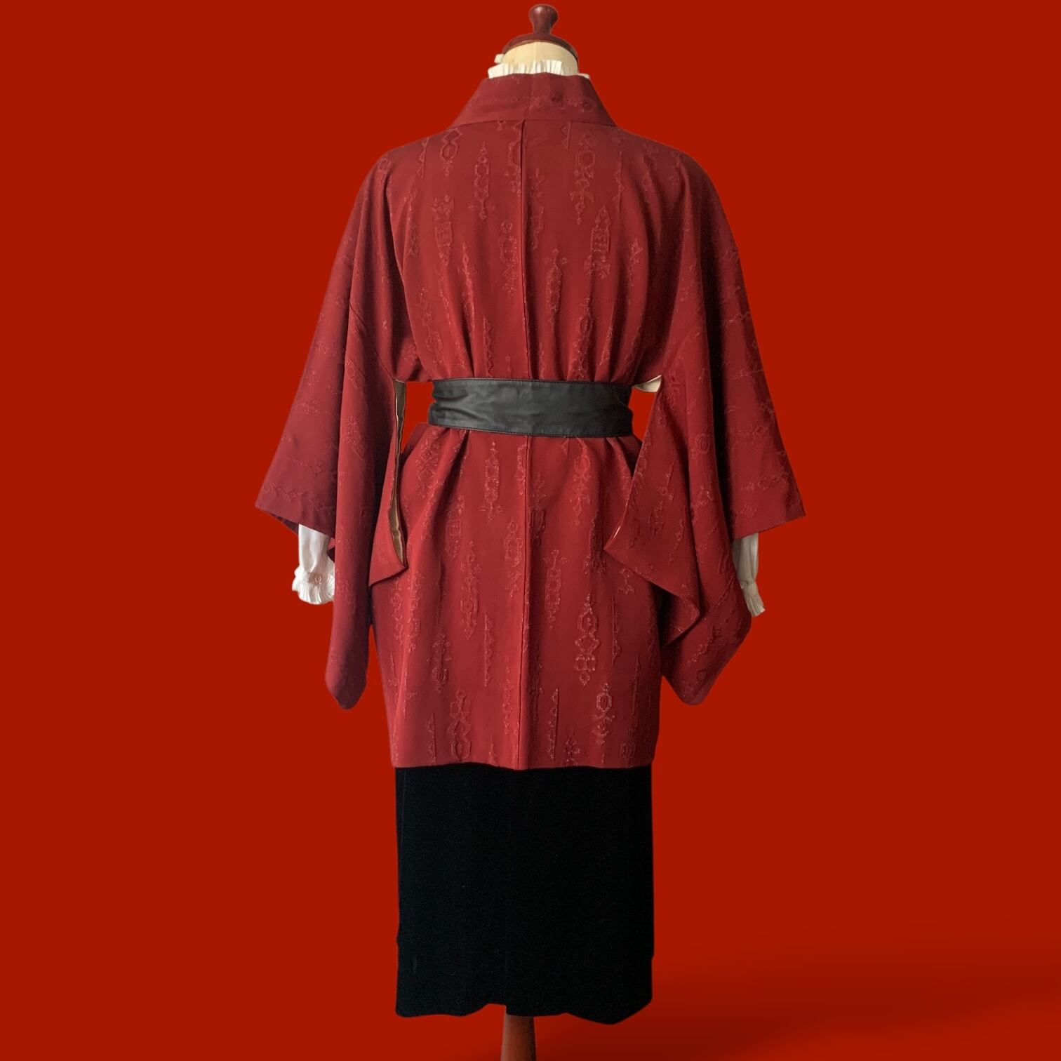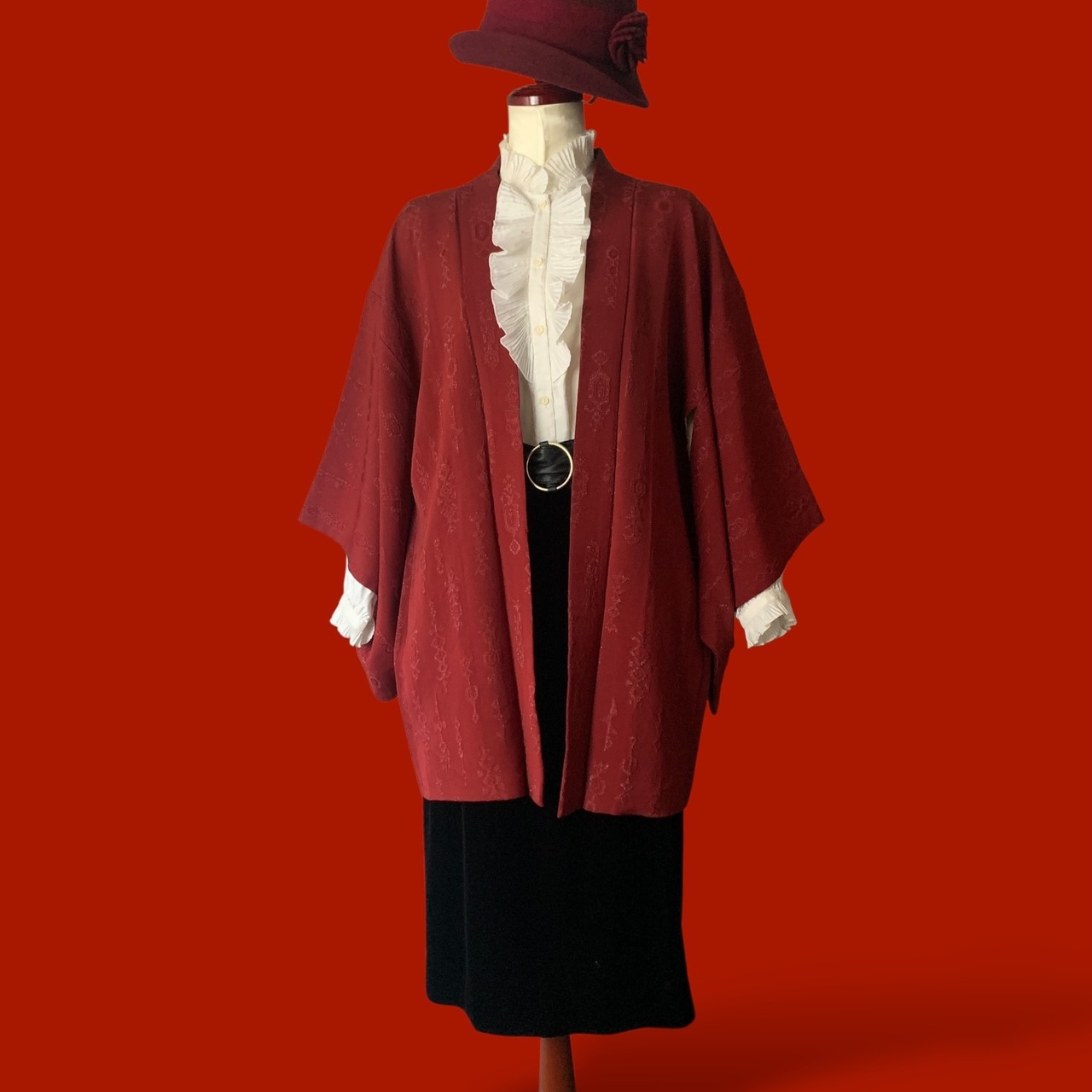 えんじ色にオリエンタルなラメ入り模様の入る素敵な羽織りをメインにクラシカルなコーディネートを。