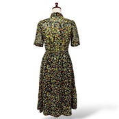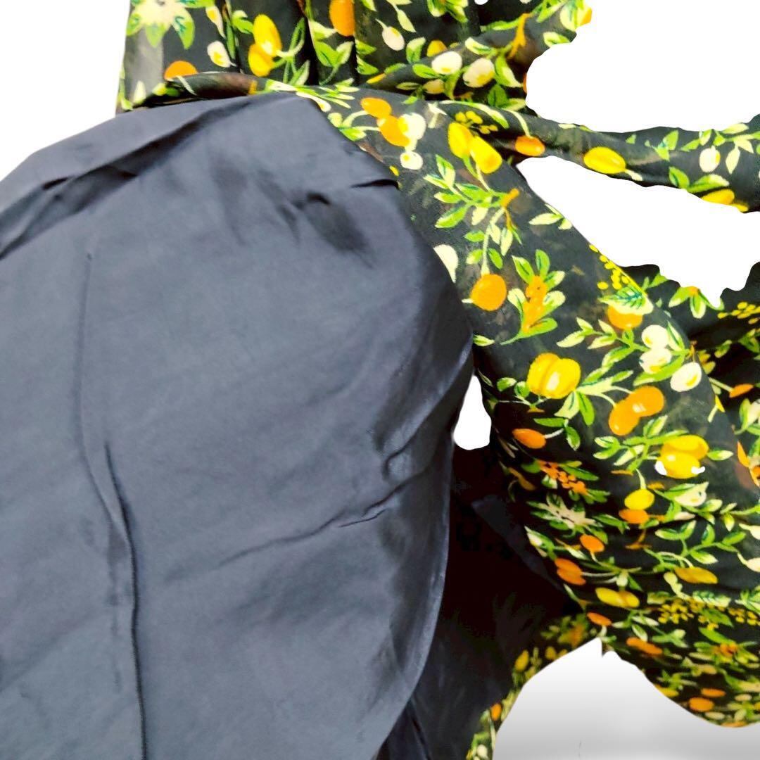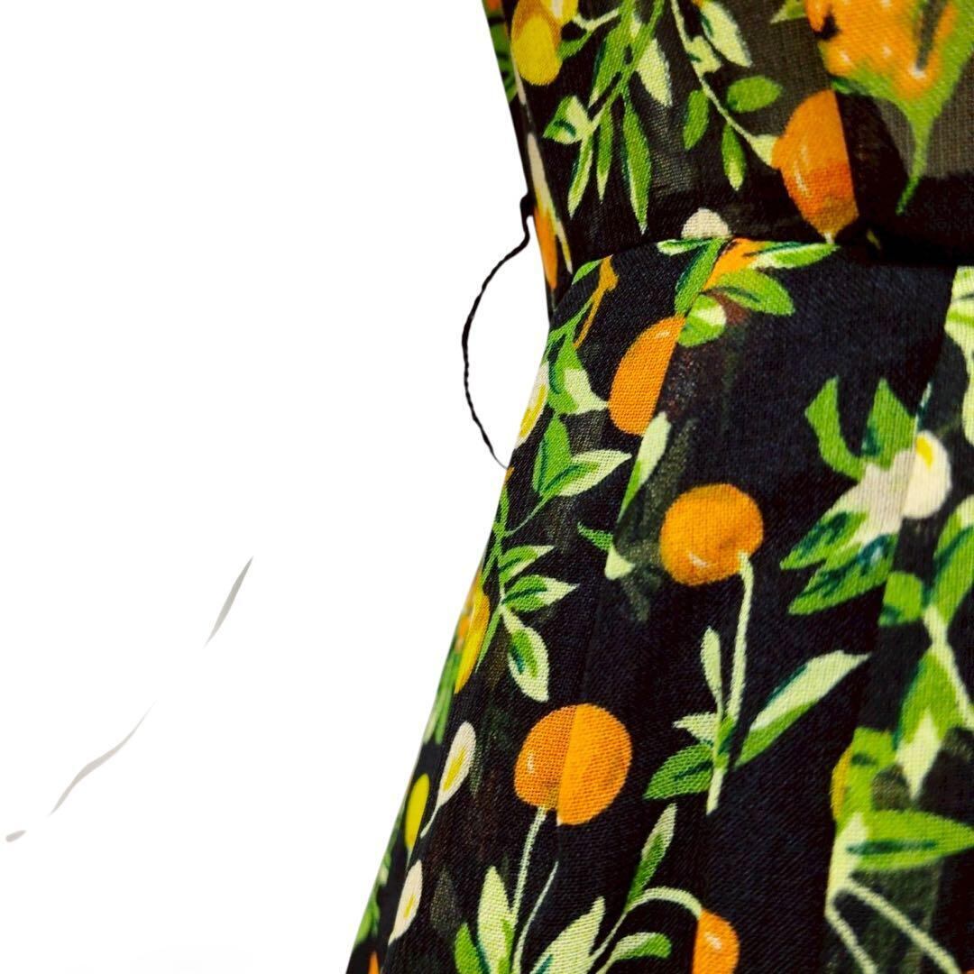 ブラックの生地いっぱいに広がる、繊細なリーフ&小花に、オレンジと黄色の小さな実がキラリ。