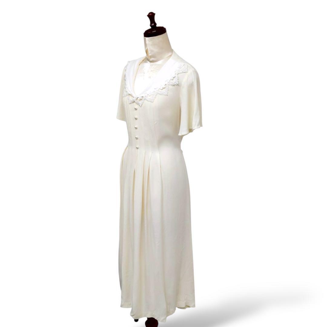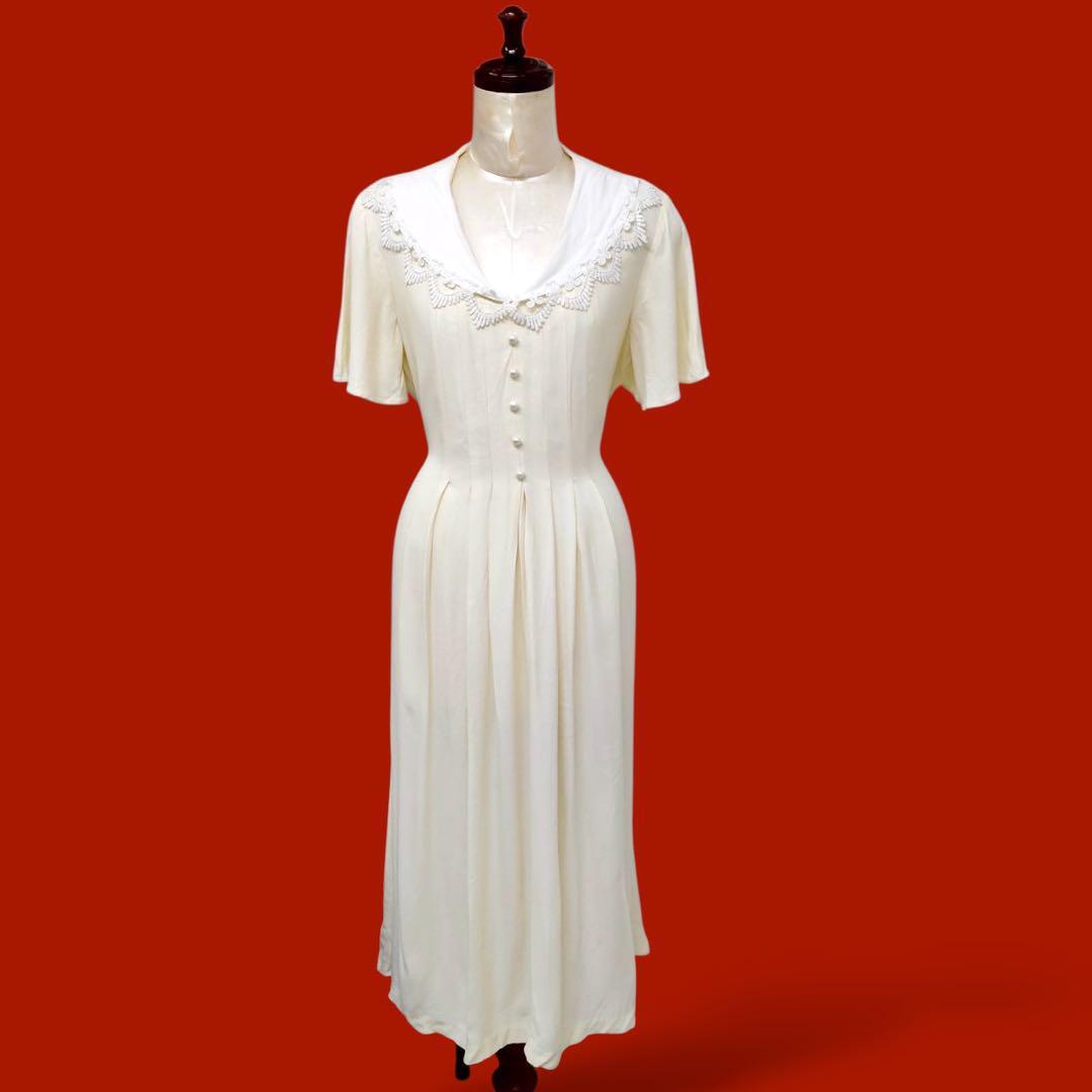 ◎クリーム色のUSAヴィンテージドレス 清楚と知性 レースえりパールボタン 古着