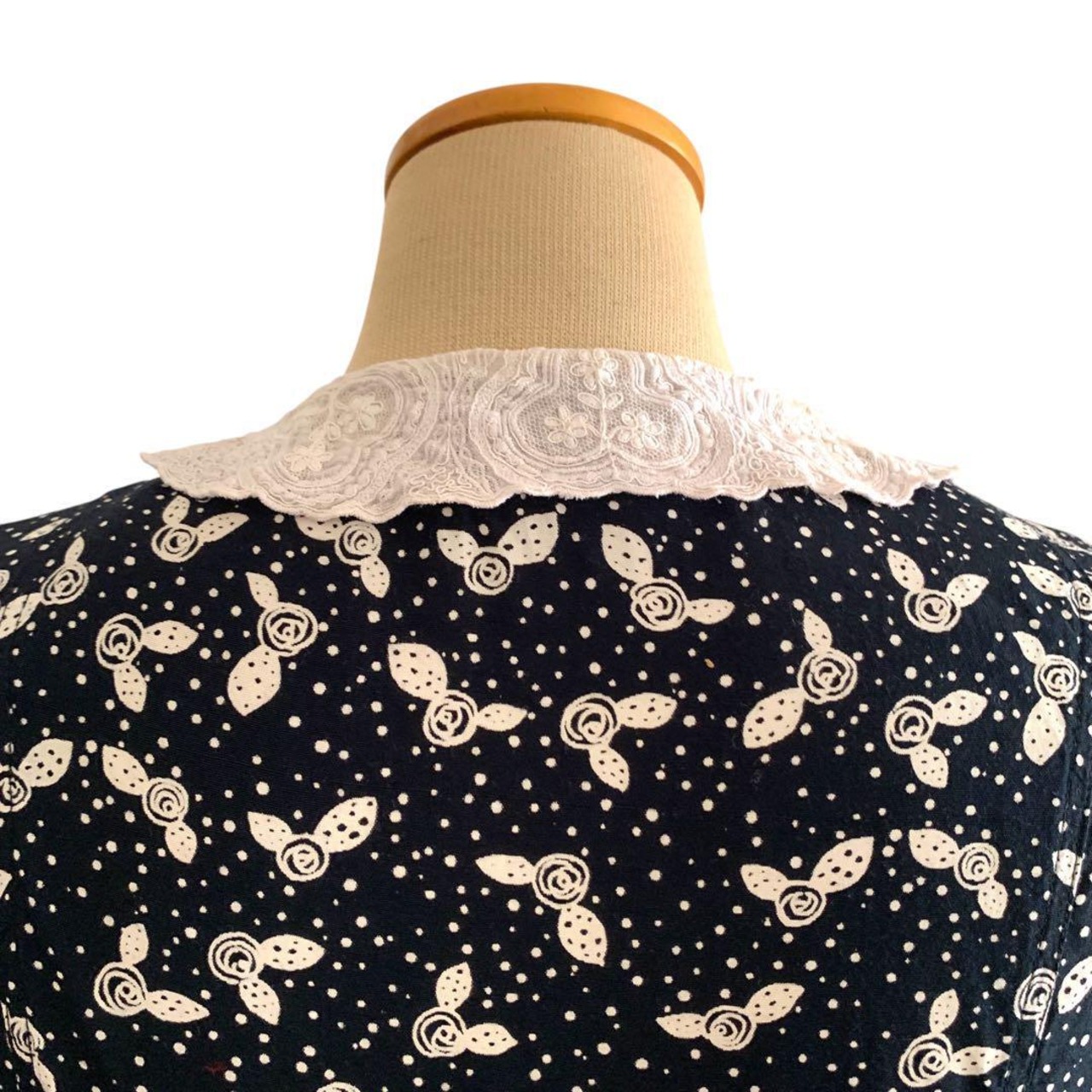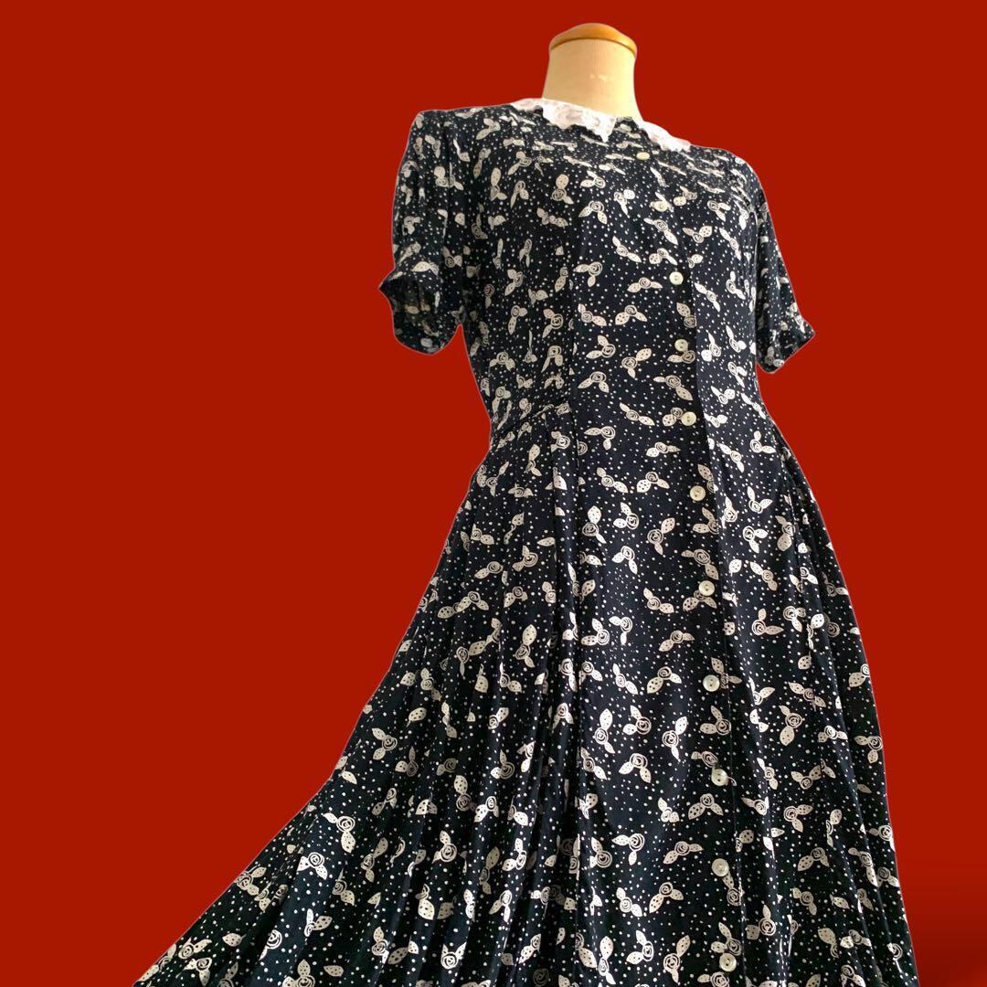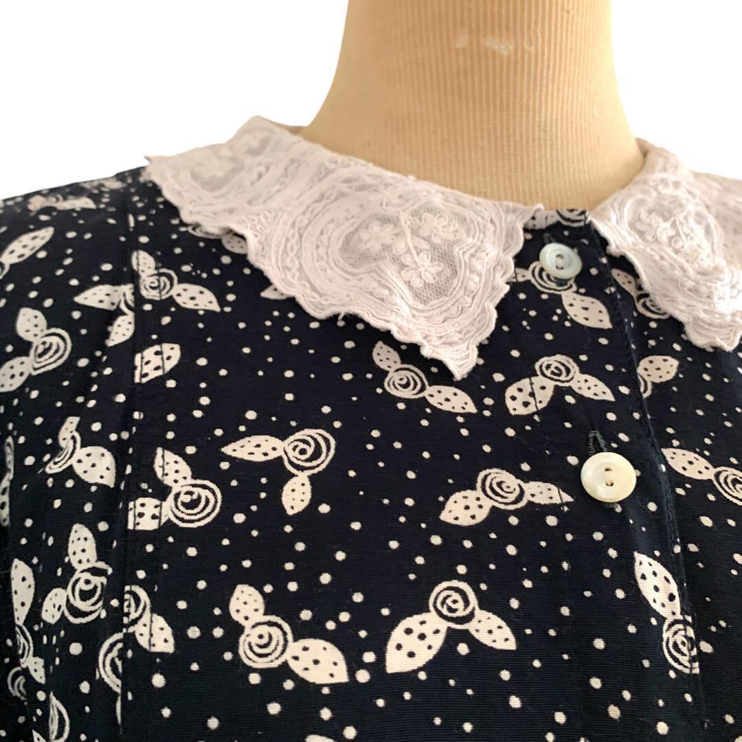 ◎USA古着 クラシック 白レースえり ネイビー総柄レトロワンピース ビンテージ