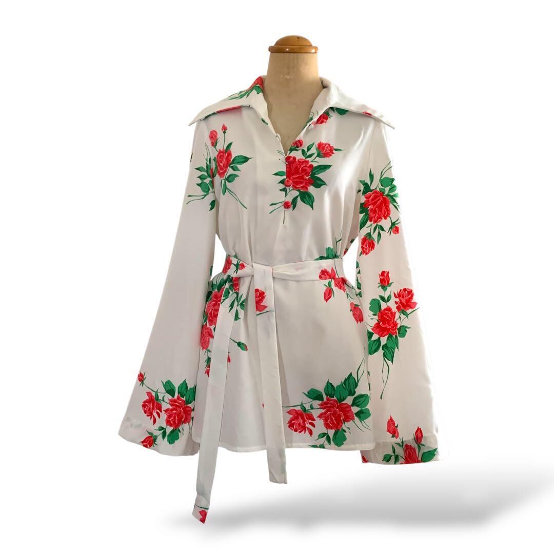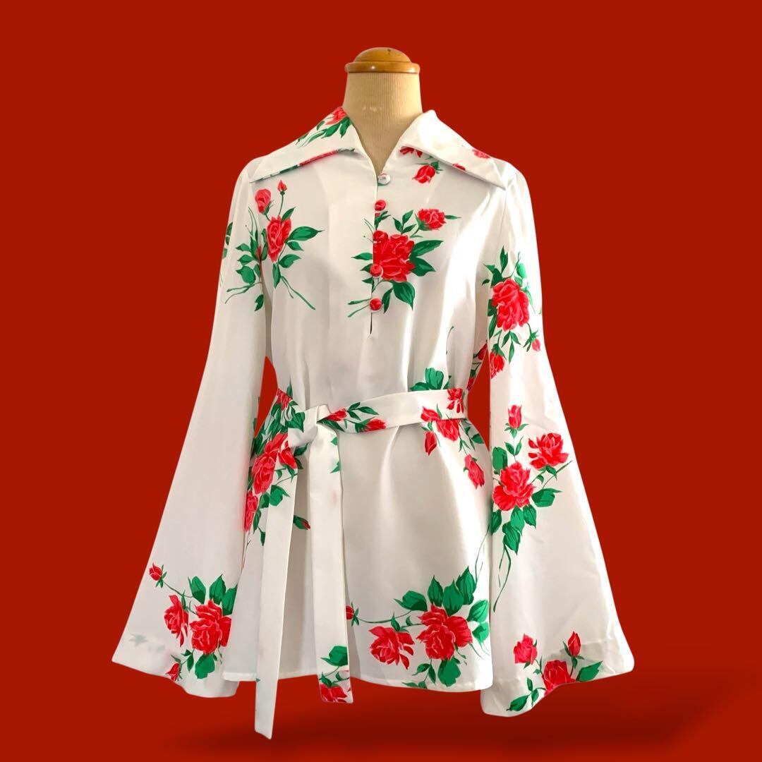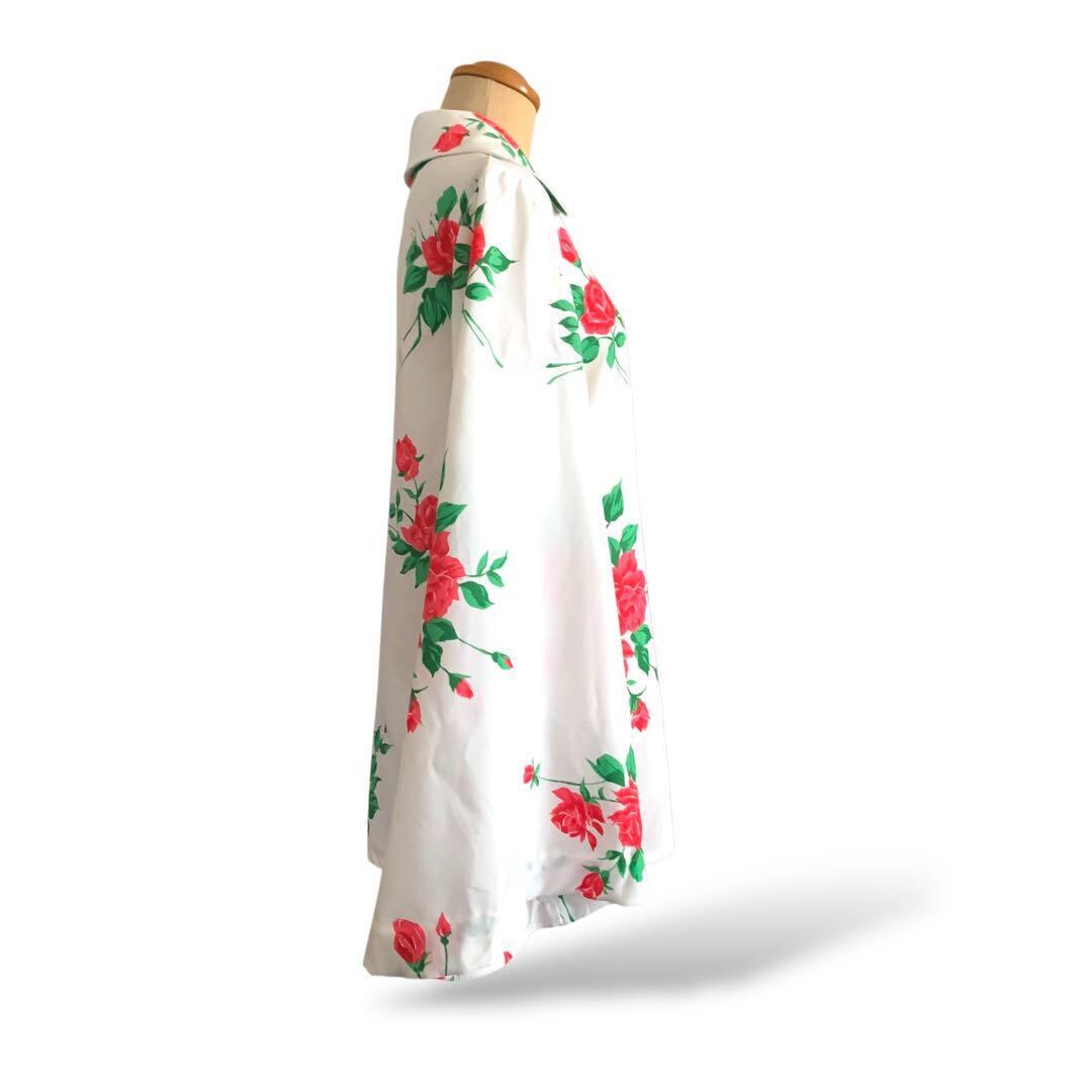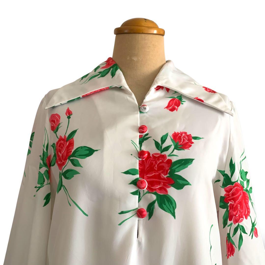 ◎薔薇咲くドラマチック袖 ヴィンテージ花柄ブラウス 白×赤 リボン ビンテージ