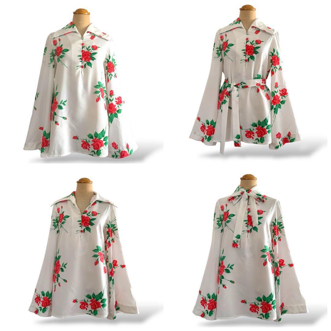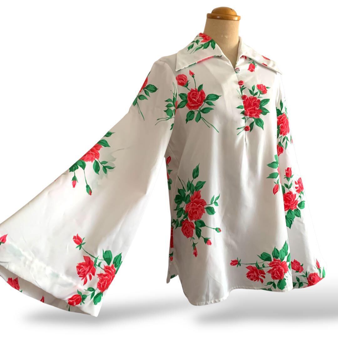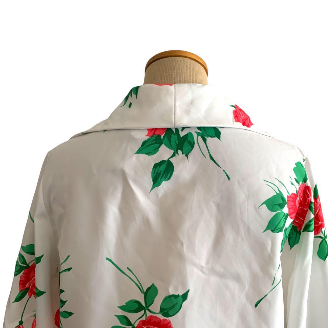 ◎薔薇咲くドラマチック袖 ヴィンテージ花柄ブラウス 白×赤 リボン ビンテージ