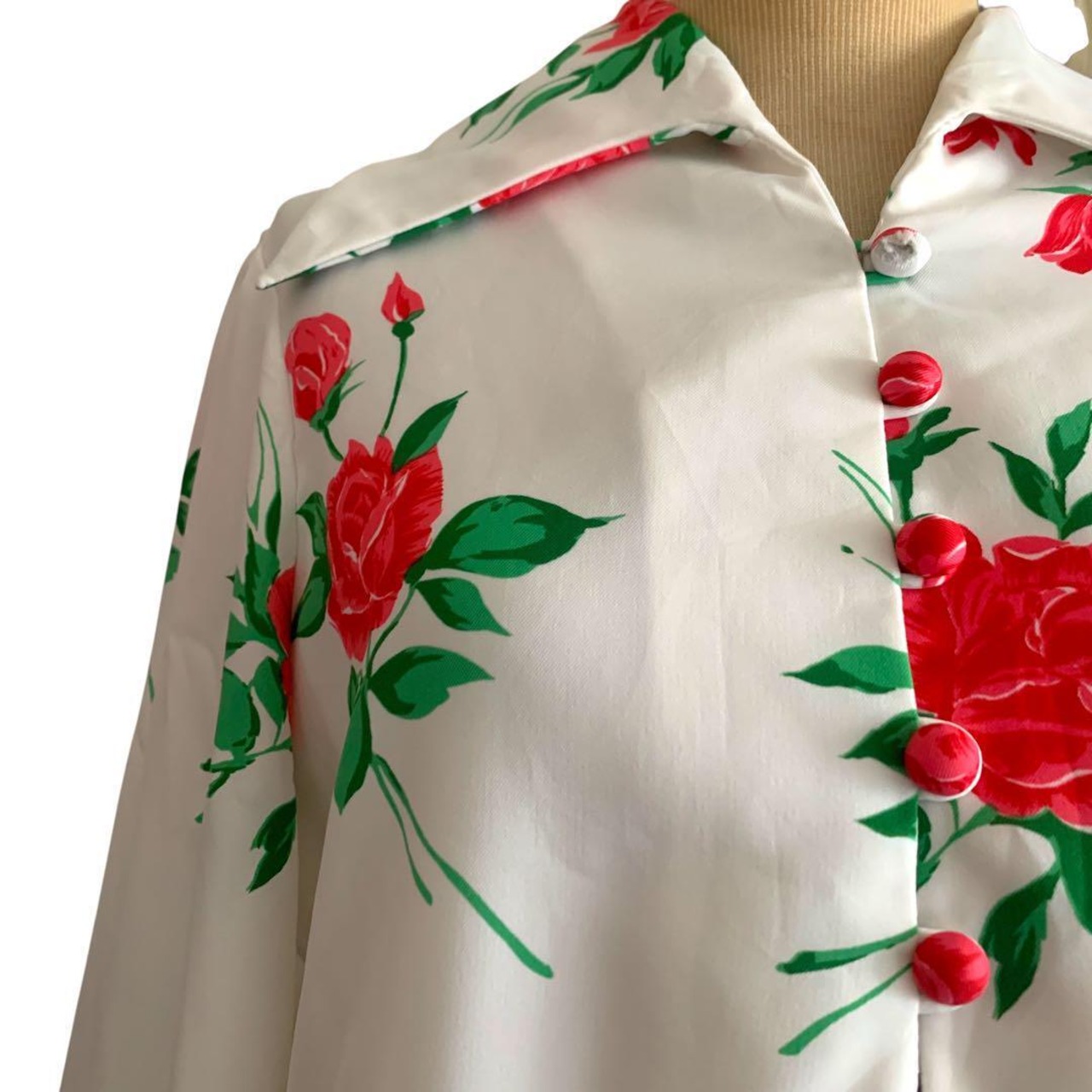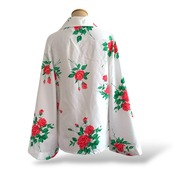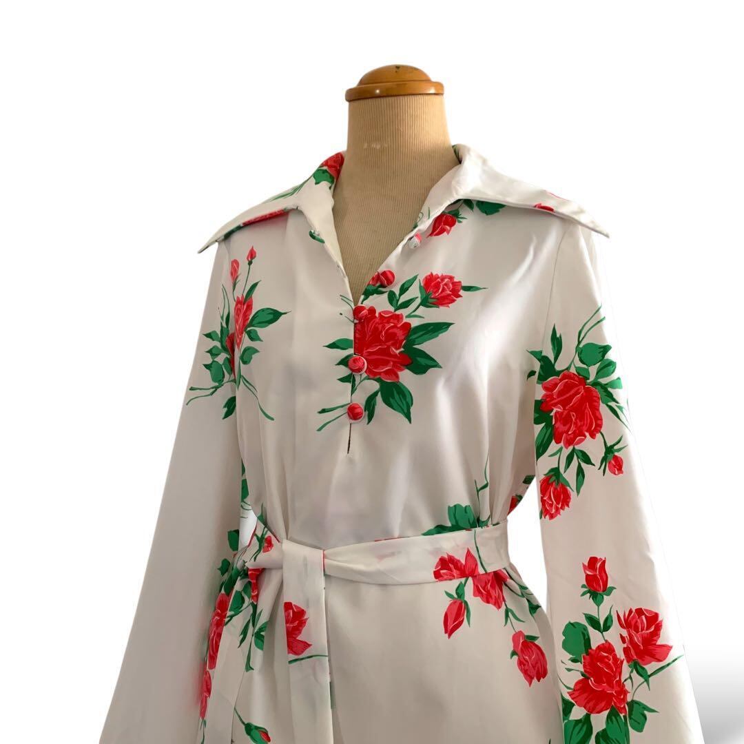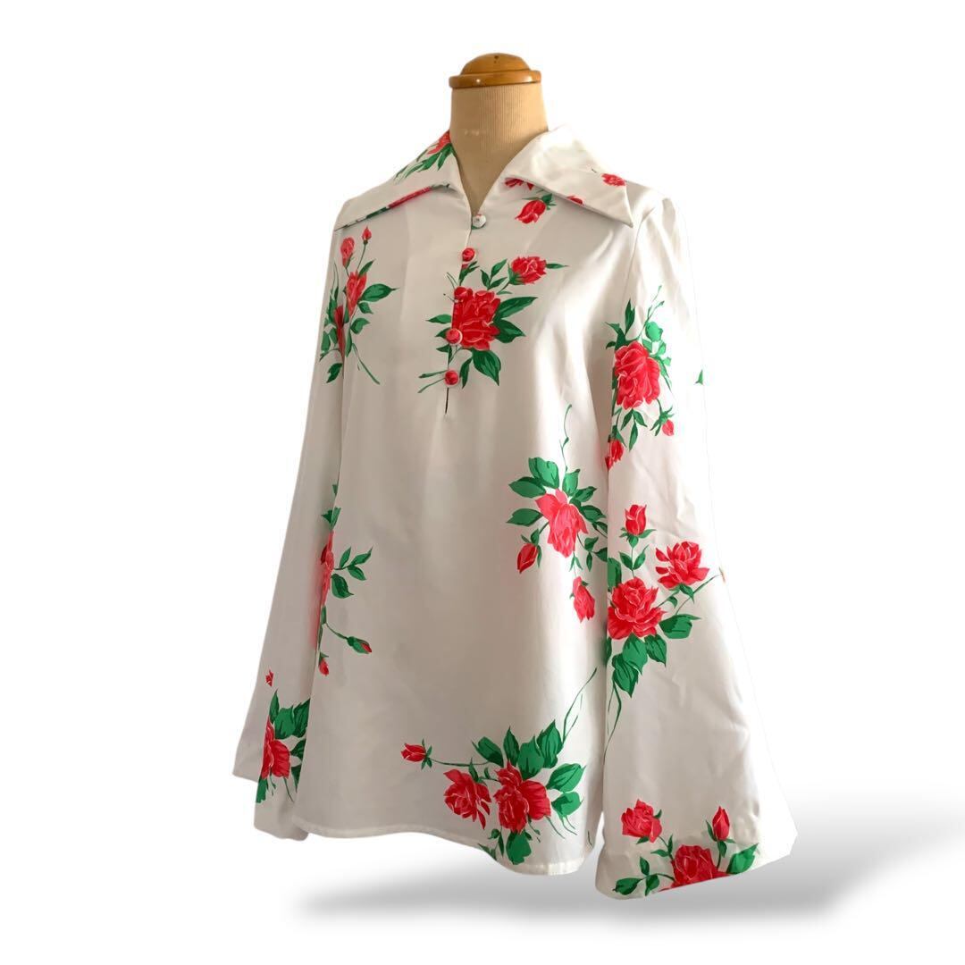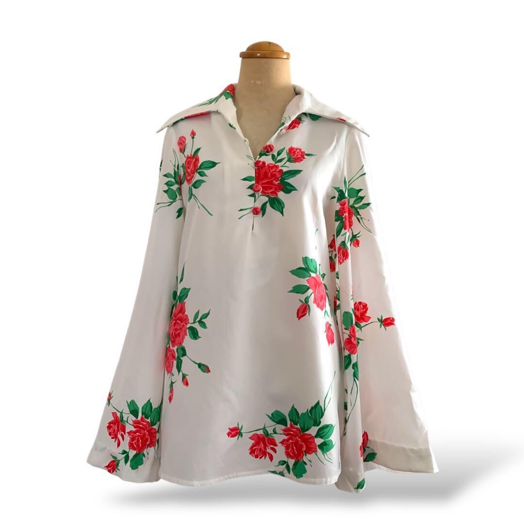 ◎薔薇咲くドラマチック袖 ヴィンテージ花柄ブラウス 白×赤 リボン ビンテージ