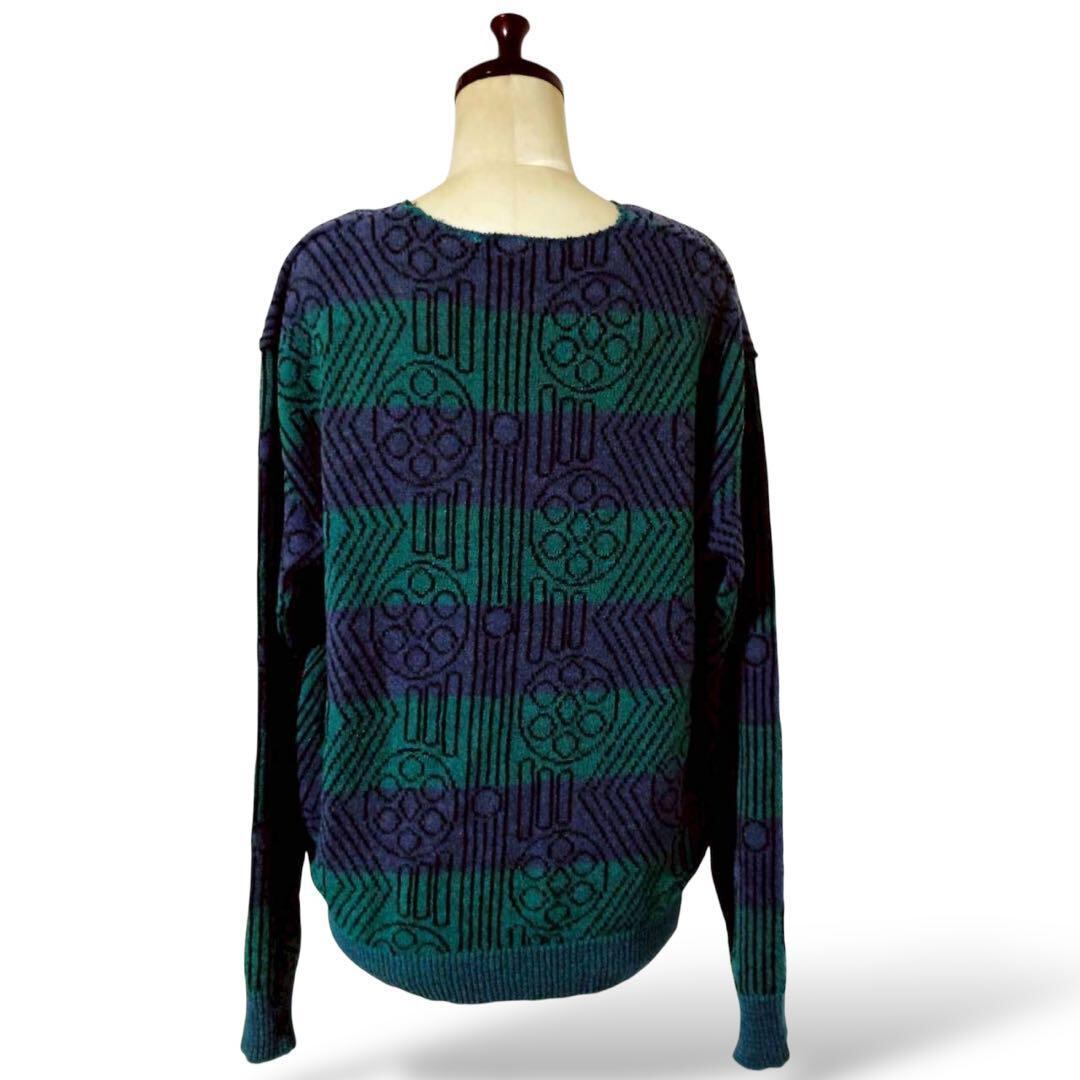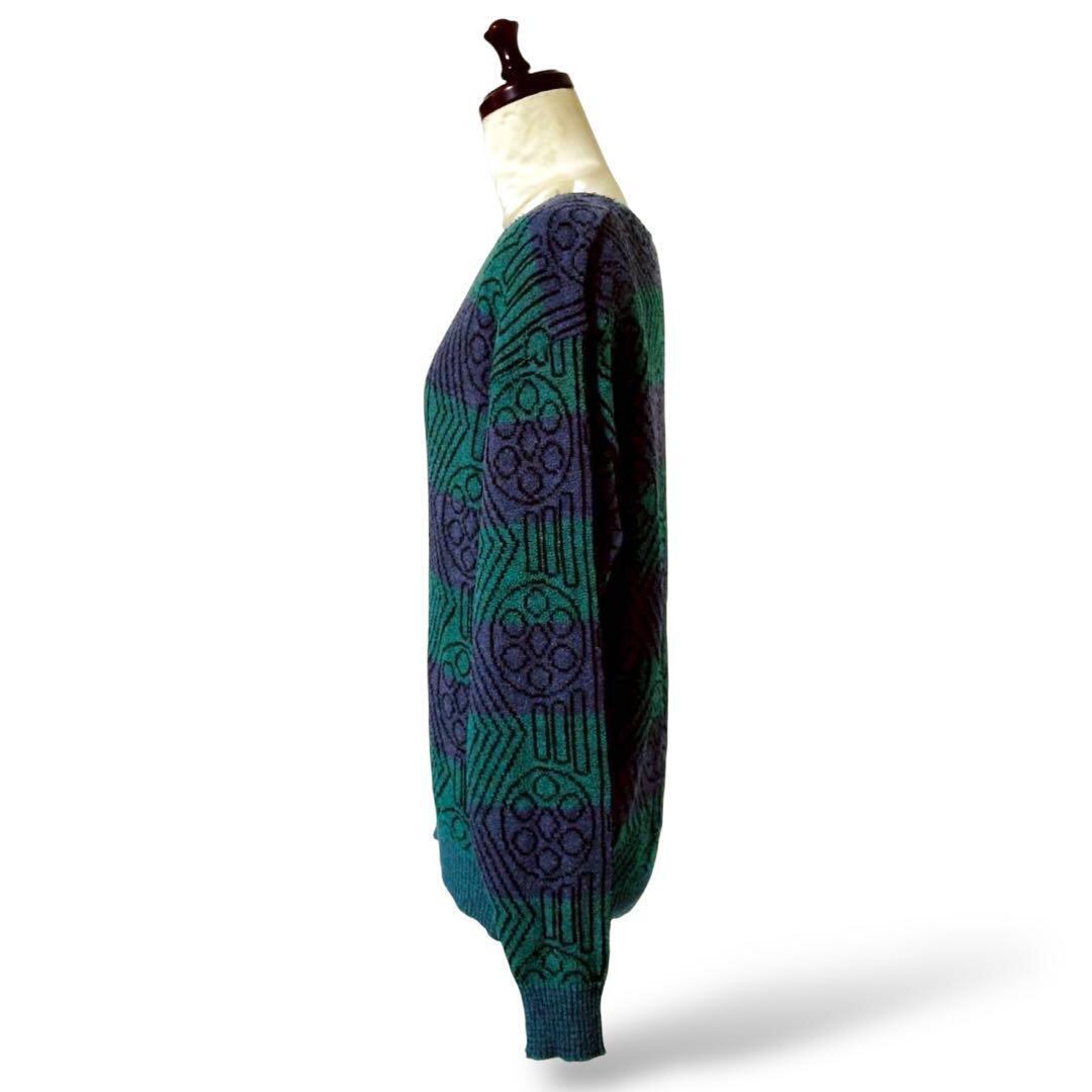 このグリーン×パープルの幾何学柄ニット、一枚で存在感バッチリよ♡